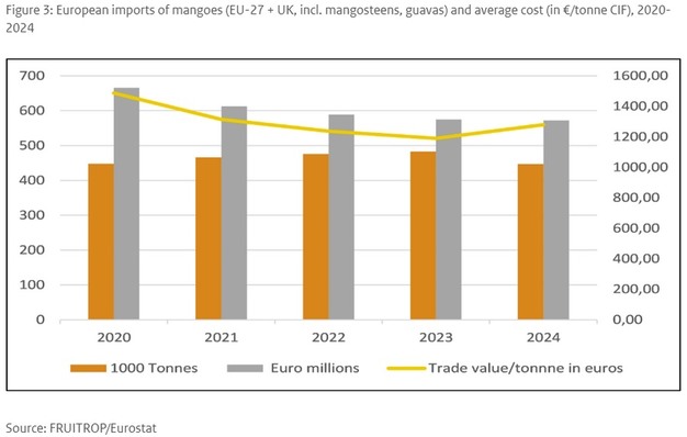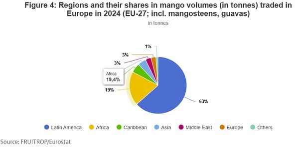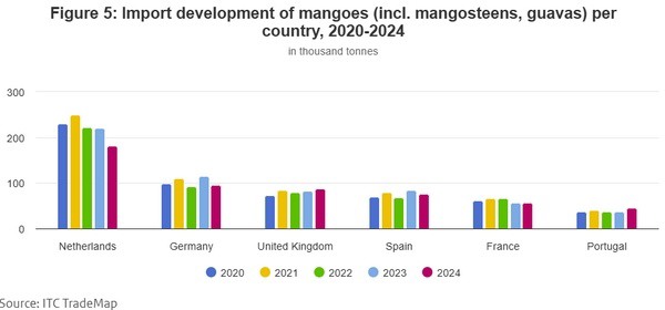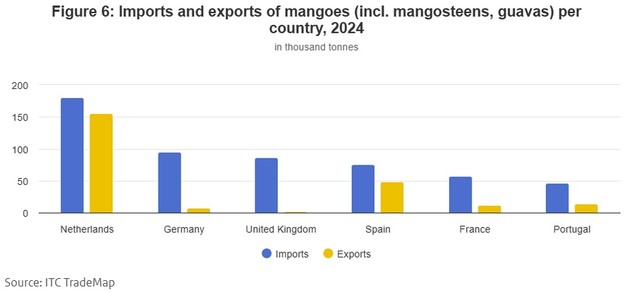Mangoes are imported into Europe in increasing volumes, supported by year-round supply from multiple origins and growing demand for fruit with consistent eating quality. European consumers show a clear preference for low-fibre varieties, particularly Kent and Keitt, and demand is rising for mangoes sold as tree-ripe, ready-to-eat or fresh-cut. The main European import markets for fresh mangoes are the Netherlands, Spain, Germany, France, and Belgium.