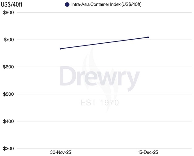 Drewry expects intra-Asia freight rates to remain broadly stable during the second half of December as Christmas-related demand eases. Rates are then forecast to firm in January 2026, supported by tighter vessel capacity during an extended peak season.